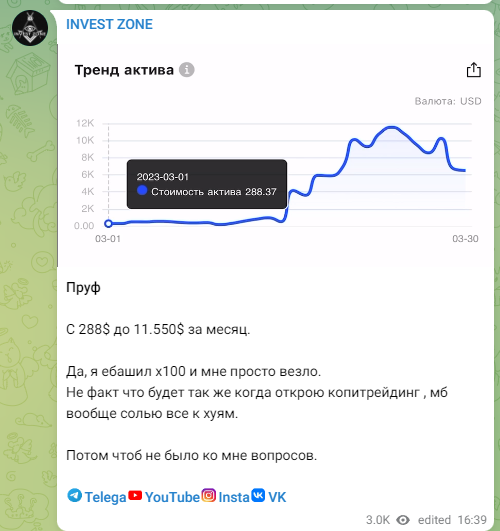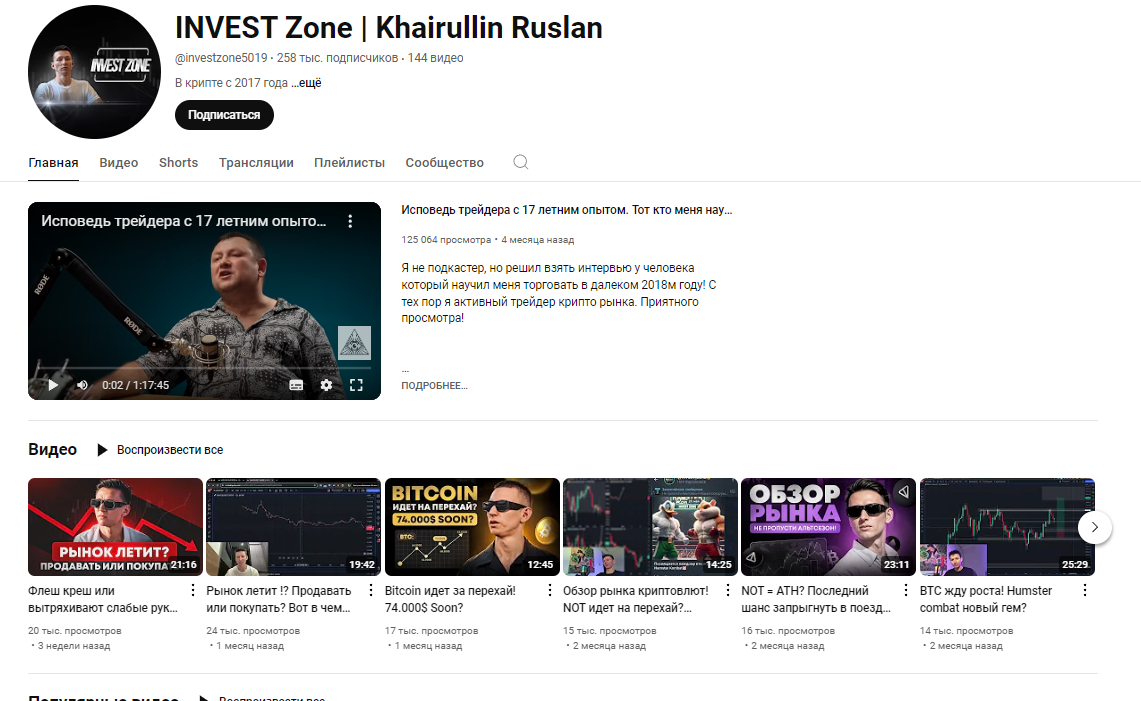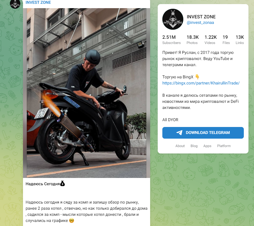 Телеграмм трейдер Руслан Хайруллин развивает канал с 2019 года и за последние несколько месяц увеличил аудиторию в десятки раз. При этом активность в канале остается крайне низкой, при 2,5 миллиона подписчиках посты набирают только 15-20 тысяч просмотров. Есть Ютуб канал Invest Zone | Khairullin Ruslan, на него подписано 260 тысяч человек, хотя совсем недавно их численность едва достигала 10 тысяч. В investzone5019 есть обзоры ретродропов и криптовалютных тапалок, обзоры рынка и интервью с разными трейдерами. В invest zonaa открыты комментарии, доступны реакции. Руслан с 2017 торгует криптой, пишет об активах свои мысли и зарабатывает на всем — NFT, игры, дропы, торговля. Трейдер является партнером биржи Bingx и предлагает подписчикам систему бонусов по реферальной программе.
