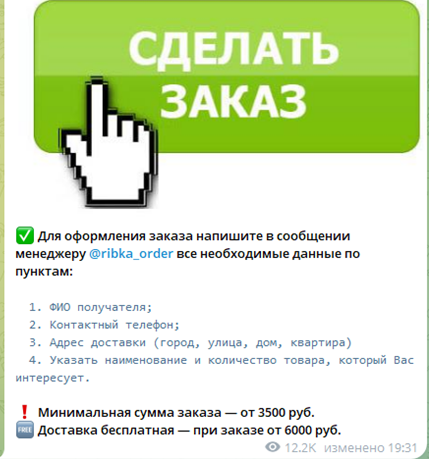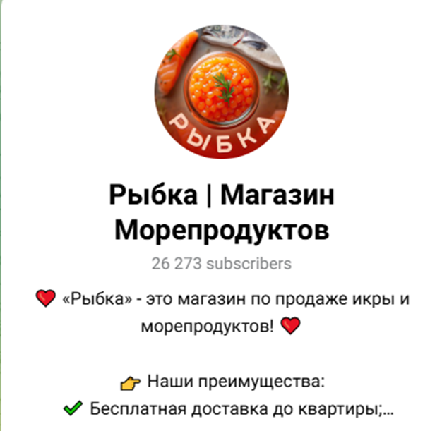 «Рыбка» магазин морепродуктов в Телеграме, который работает исключительно онлайн. Реального магазина у проекта нет, на канале не предоставлено ни единого документа, подтверждающего, легальность работы.