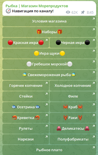 Телеграм-канал «Рыбка магазин морепродуктов» предлагает купить следующие виды продукции: