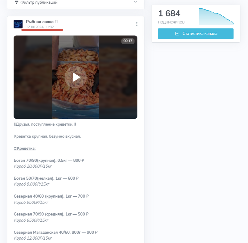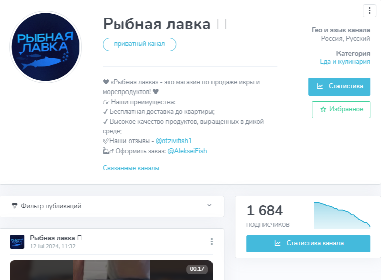 Странно только то, что сейчас доступа к официальному каналу нет. Ссылка, которая указывалась на данном сервисе, является уже устаревшей или удаленной. Однако, на площадке нам все удалось увидеть наполнения группы.Стоит заметить, что последний пост тут вышел 12 июля 2024 года. Причем это рекламная публикация с актуальным ассортиментом и ценами на продукцию. Сообщения о том, что магазин прекращает работу или куда-то переезжает – здесь нет. Странно, что в телеграмм «Рыбная Лавка» не было какой-то документации и сертификации на продукцию.