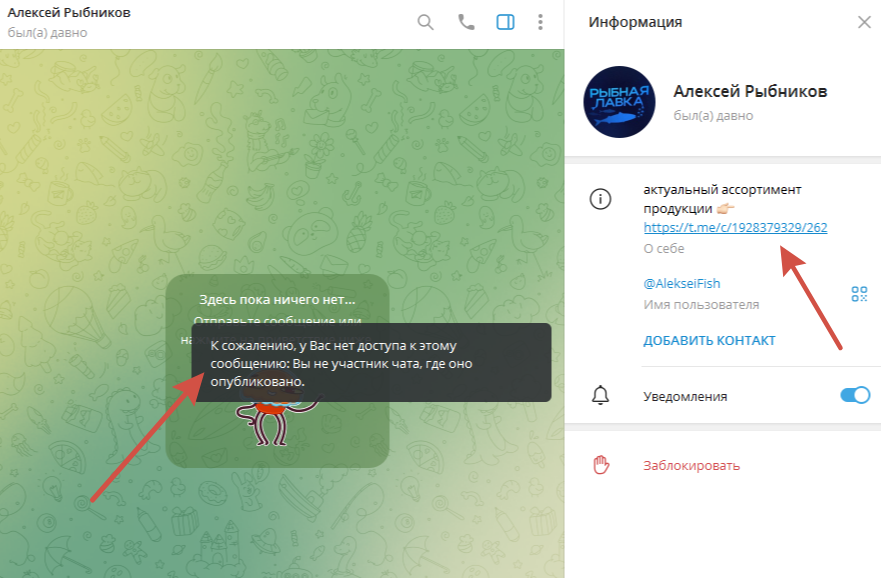 Сегодня на проверку нам попался аккаунт некого Алексея Рыбникова @ AlekseiFish. Судя по его аватарке, он является владельцем рыбной лавки. Также в описании блога указывается и ссылка на актуальный каталог продукции. Но нам данное сообщение не открылось, так как оно доступно только участникам чата, где и находится данный прайс.