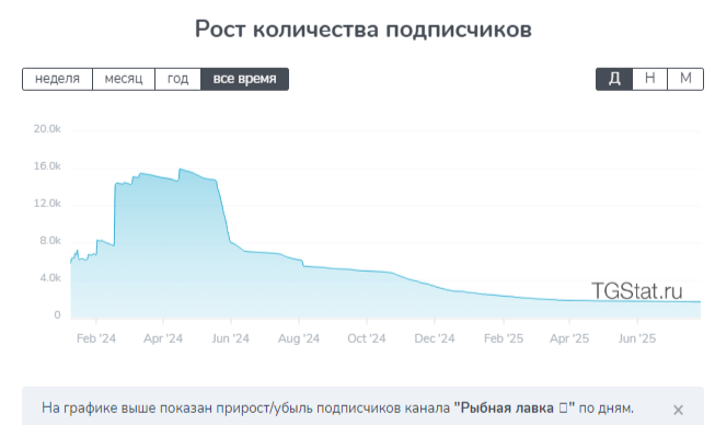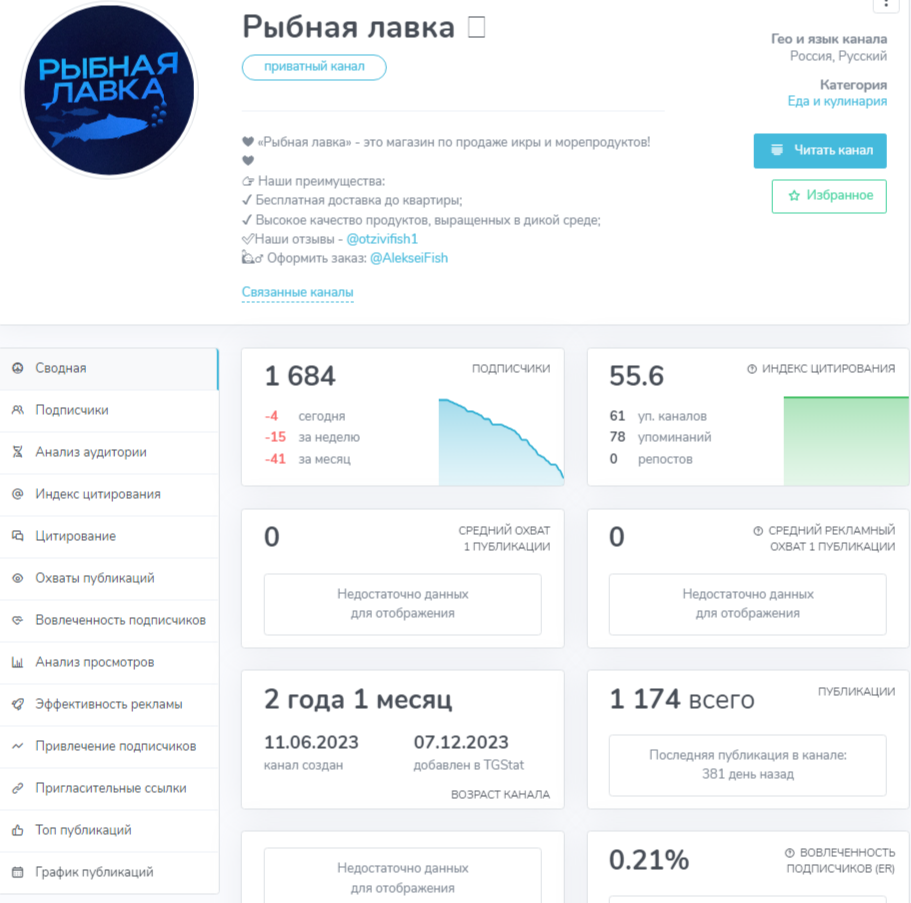 Третий источник, где засветился продавец Алексей Рыбников, оказался ресурс со статистикой его официального блога в телеграме. Здесь мы увидели, что на канал подписано 1648 зрителей, однако сейчас с него идут активные отписки. Плюс, мы узнали, что проект функционирует с июня 2023 года. Странно, что за два года данная лавка не получила известность и успешную репутацию.