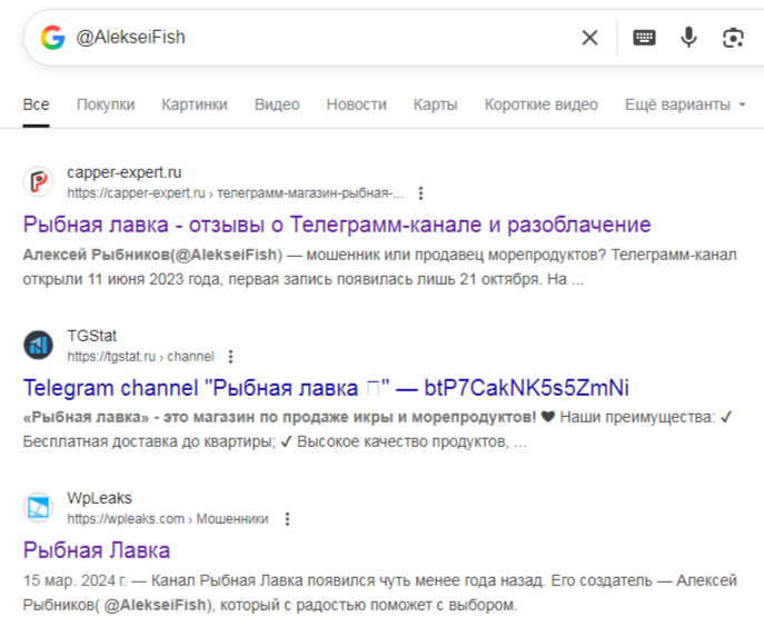 Чтобы узнать подробности о данной личности, мы обратились к поисковику. Оказалось, его имя упоминается всего на трех источниках, два из которых являются разоблачениями данного проекта. Об отзывах о проекте «Рыбная Лавка Морепродукты В Телеграмм» мы расскажем позже. Но исходя из увиденного, становится понятно, что это фальшивый проект, который занимается намеренным мошенничеством.