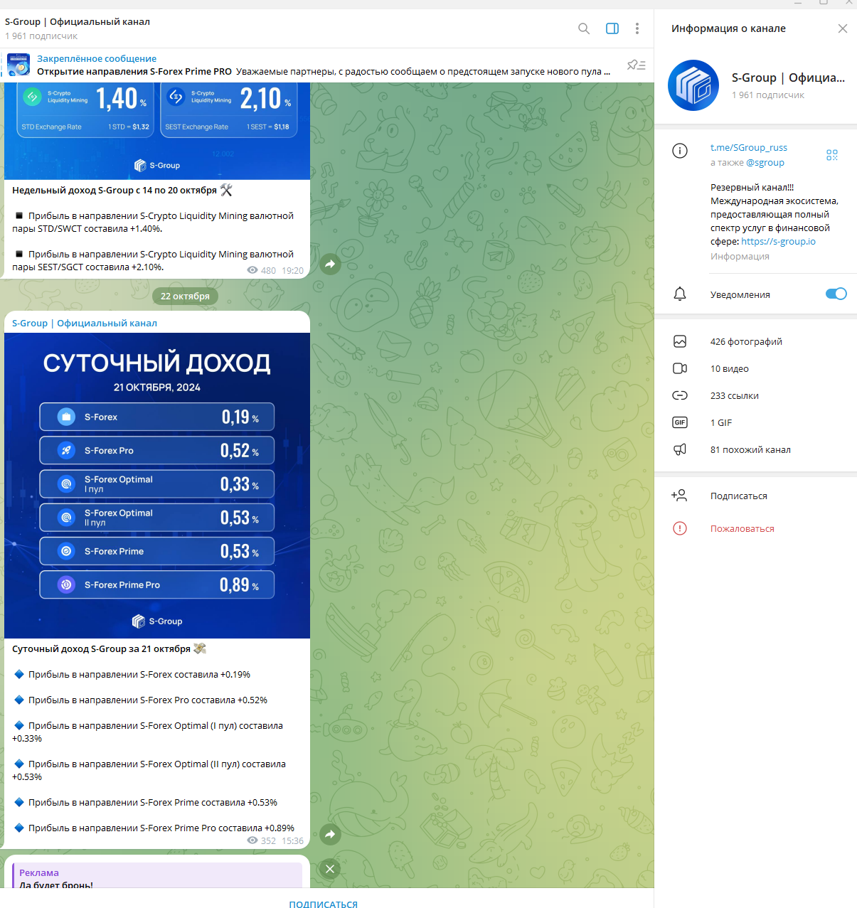 С Групп инвестиции – анонимная компания, которая предоставляет на своем сайте только сведения об адресе регистрации, а также предоставляет 2 email для связи физическим и юридическим лицам. Несмотря на то, что официальный сайт был заблокирован ЦБ РФ, контора продолжает выставлять контент в своем Телеграм-канале.