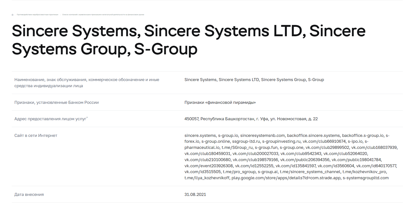 Площадка – достаточно новый проект, который был создан ориентировочно в 2021 году. Конечно, лицензий и разрешений S GROUP IO не получила. Более того, ее деятельностью заинтересовался ЦБ РФ и внес ее в реестр компаний с выявленными признаками нелегальной деятельности на финансовом рынке:
