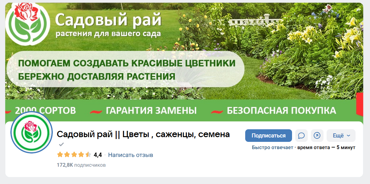 Магазин «Садовый рай» работает не только посредством Телеграма. В описании профиля до сих пор сохраняется ссылка на сайт проекта. Вот только сейчас при переходе по ней открывается страница с указанием на то, что домен свободен. Также сделать заказ на саженцы можно было посредством сообщества Вконтакте. Оно есть в сети по сей день. Причем здесь у проекта большая аудитория – 172 тысячи пользователей. Все товары, которые есть в наличии, представлены в соответствующем разделе с ценами. Телеграм-канал магазин больше не ведет, новые публикации там не появлялись уже давно.