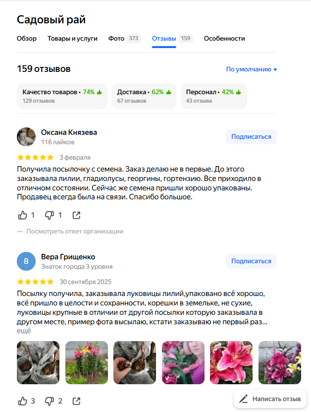 Отзывы о магазине «Садовый рай» встречаются в сети разные. С одной стороны, о самом магазине в сети много положительных откликов, особенно на городских картах. С другой стороны, нам попалось в сети несколько довольно больших комментариев о том, как покупателям пришли нежизнеспособные растения, гнилые луковицы и так далее. Также много пользователи жалуются на задержку доставки и пропуски всех сроков. Тем не менее, по количеству положительные отклики значительно превосходят отрицательные. К тому же, в самом сообществе комментарии открыты, и пользователи могут писать здесь свое мнение. Негативных откликов мы здесь не нашли.