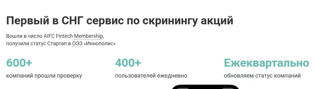 На сайте SahihInvest приложение называют первым по скринингу акций, однако нам подтвердить эту информацию не удалось, как и то, что сервисом пользуются 400+ человек ежедневно. К тому же непонятно, имеются ли в виду прирост новых клиентов или речь о тех, кто просто использует программу регулярно.