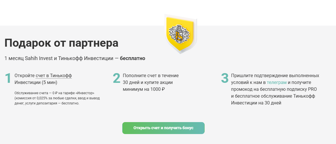 Пользователям предлагают якобы подарок от партнера-брокера. Вот только для его получения необходимо внести минимальный депозит в 1000 рублей, при этом месячная подписка на сервис стоит всего 500 р., т.е. предложение далеко не самое выгодное, если не пользоваться затем услугами Т-Инвестиций.