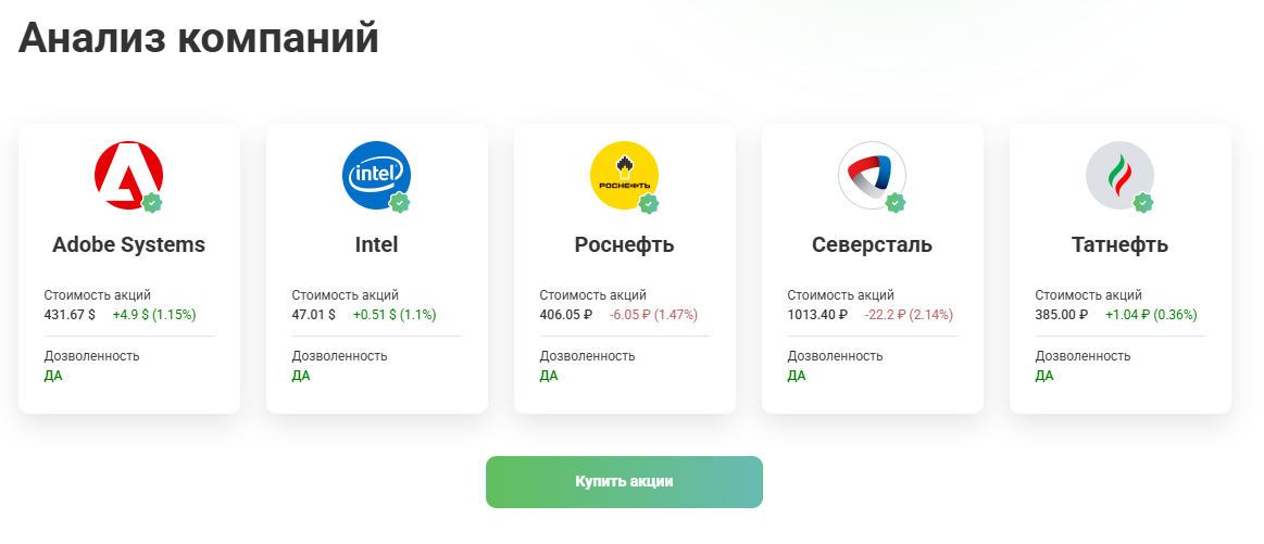 На сайте сразу же можно ознакомиться с примерами дозволенных компаний, узнать стоимость акций и их динамику. Примерно таким же образом это и должно выглядеть в приложении.