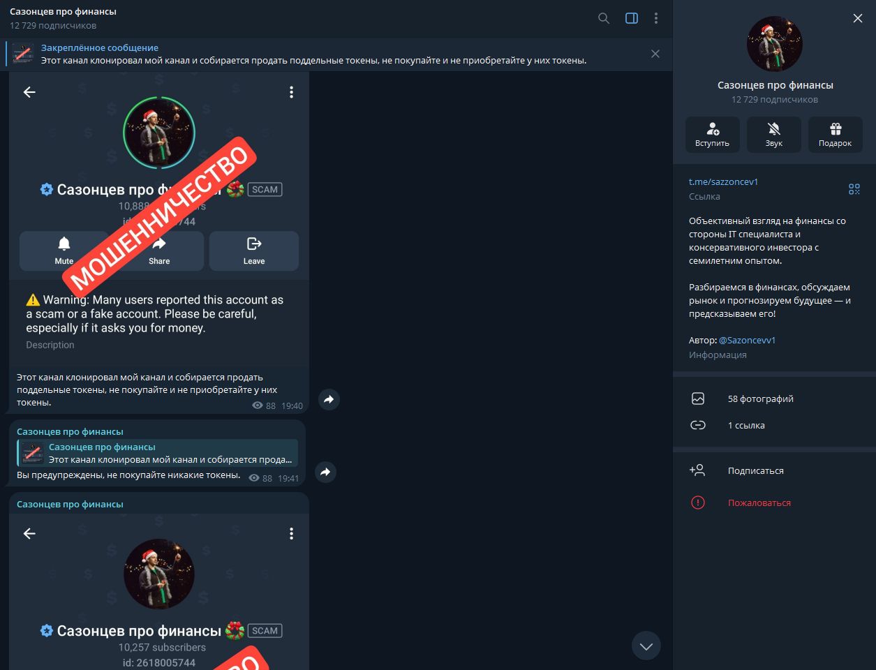 Кроме того, в Телеграме найдено схожее сообщество с аналогичным названием «Сазонцев про финансы» (sazzoncev1), где Иван Сазонцев постоянно предупреждает подписчиков о краже его бренда для использования в мошеннических целях.