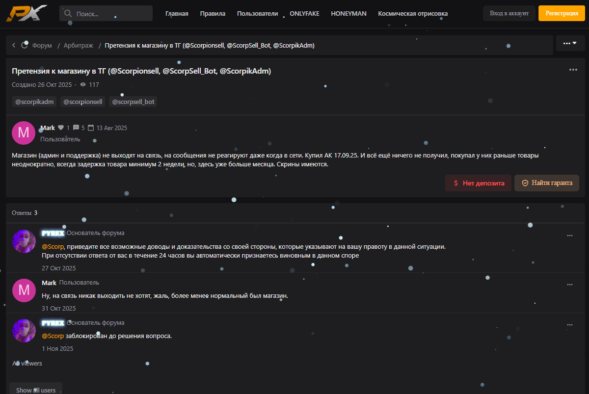 Клиенты площадки Scorpmarket сталкиваются сразу с несколькими серьезными рисками. Первый и самый очевидный — обычное мошенничество: после перевода денег через бота пользователь может просто ничего не получить, а обратиться за возвратом будет некуда, так как поддержка либо молчит, либо исчезает вместе с очередным аккаунтом.