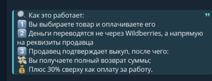 Доходность, которую обещала Мария, фантастическая для любого способа заработка.. Уже этот факт явно подсвечивает, что перед нами нечестная схема получения дохода. Кроме того, автор канала в своем блоге подчеркивала, что средства она переводит не через маркетплейс Wildberries, а «напрямую на реквизиты продавца». Видимо, вкладчик должен был отправить деньги непосредственно ей или другим мошенникам на банковскую карту дропа. Это значит, что у него не было ни малейшей возможности вернуть свой перевод.