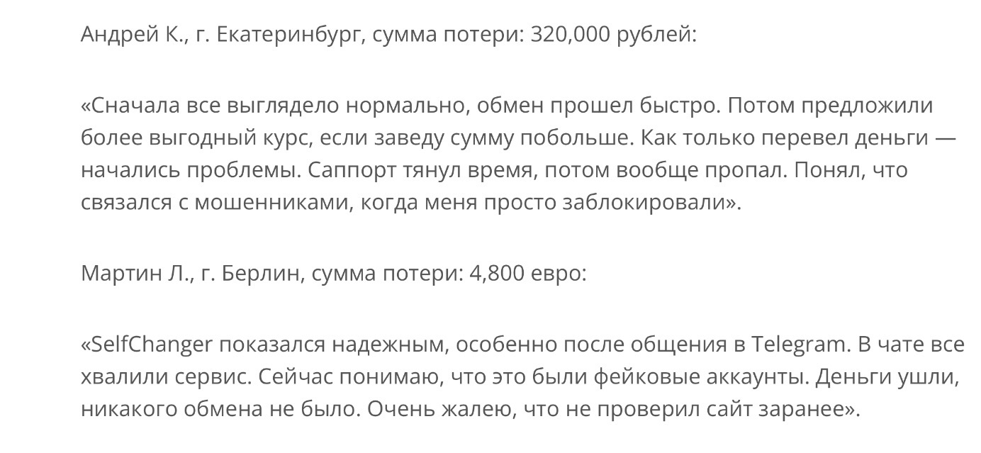 Нам удалось найти всего два фидбэка, и оба оказались негативными и с очень печальным рассказанным опытом. Их авторы потеряли крупные суммы денег, воспользовавшись данным обменником. Кого-то развели на суммы покрупнее, изначально заманив успешной транзакцией, а кого-то со старта оставили без гроша.