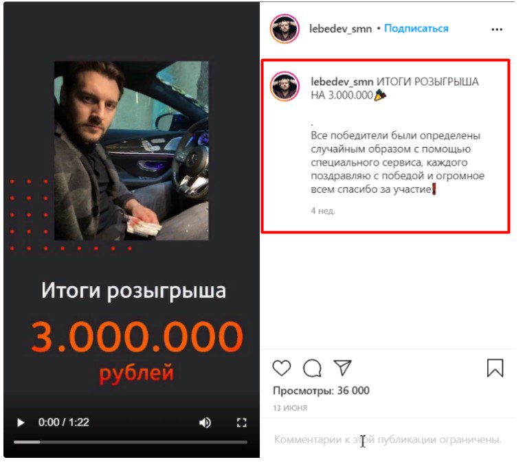 - Аудитория привлекается за счёт конкурсов, исход которых известен в профиле, но нет подтверждения, что приз реально получают.