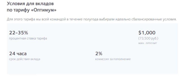 - Оптимум с вложением минимальной суммы на уровне 73500 рублей, но ставка падает до 35%. Этот тариф приносит прибыль быстрее всего, а комиссия за работу такая же, как в первом пакете.