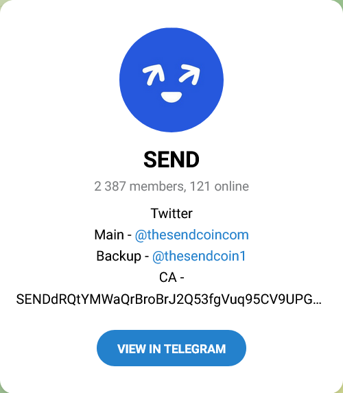 Как можно стать участником чата с ником в Телеграмм @thesendcoinsolana, неизвестно. Вероятно, по приглашению авторов крипты Send, только где его взять, ясности нет. Инфоканала в Telegram, где могли бы публиковаться новости, прогнозы и перспективы развития проекта, нет.