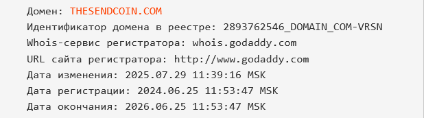 Сайт, на котором размещена информация о токене, был запущен в работу в июне 2024 года, а в июле 2025 года thesendcoin com изменили.