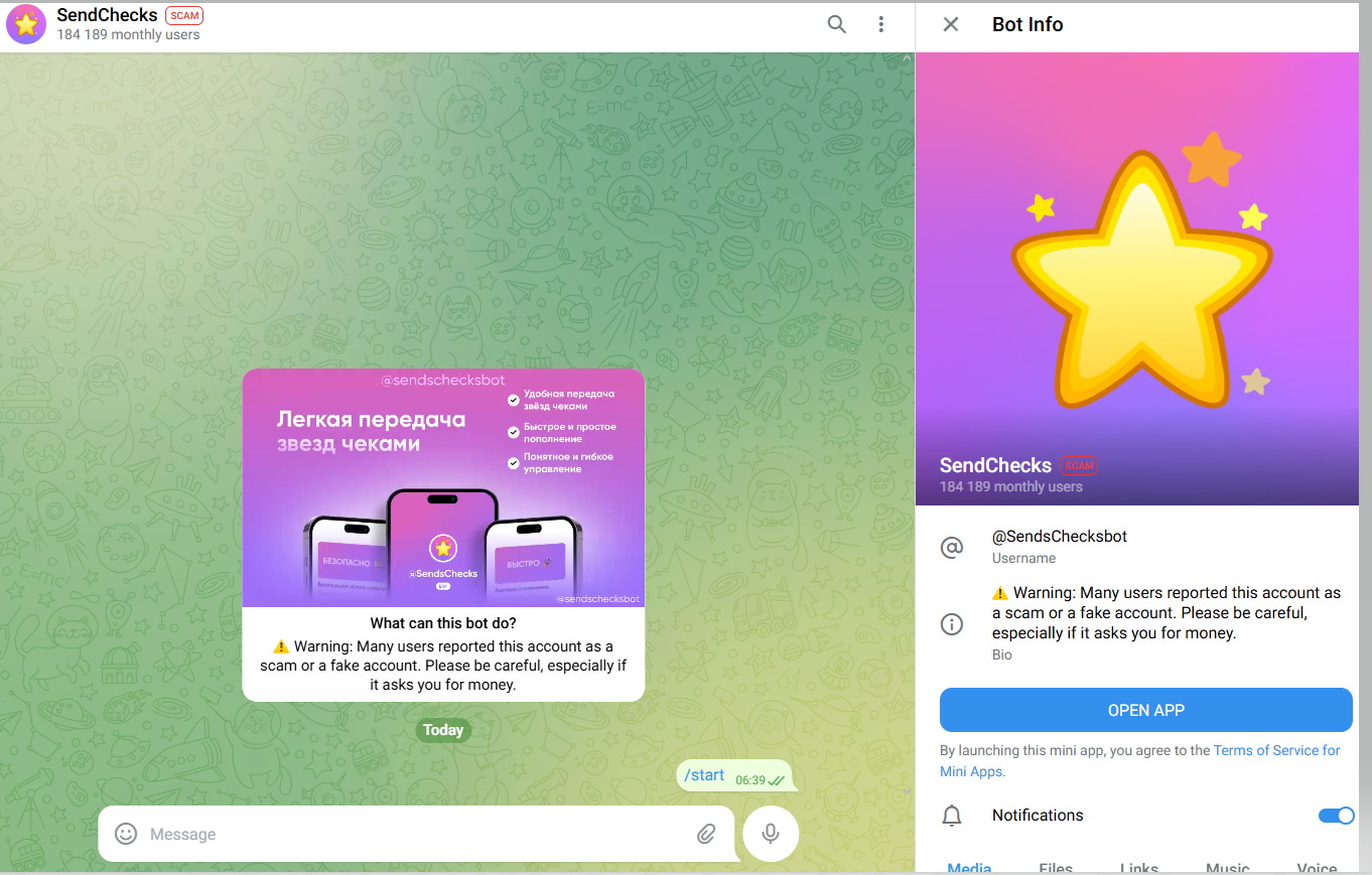 Теперь расскажем детальнее, что за бот Sendschecksbot и какие у него функции. Рассматриваемый проект был запущен в 2025 году, тем не менее информация о разработчиках отсутствует. На сегодняшний день бот не функционирует, и перейдя к нему, можно заметить отметку “Скам”, которая была выдана за регулярные жалобы от пользователей.