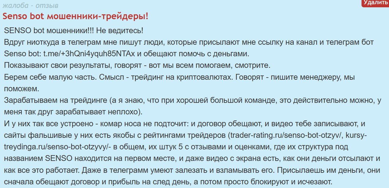 Sensa Support — анонимный Телеграм-бот без юридической базы, реальной торговой деятельности и каких-либо контактных данных. Авторы проекта привлекают жертв через спам-рассылки, создают иллюзию заработка с помощью поддельных отчетов и видеозаписей, предоставляют электронный договор как прикрытие. После внесения денег вывести их уже не получится.