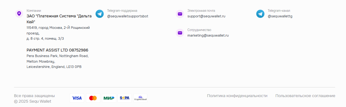 - техподдержка работает через Телеграмм аккаунт @ sequwalletsupportsbot и электронную почту support @ sequwallet ru;