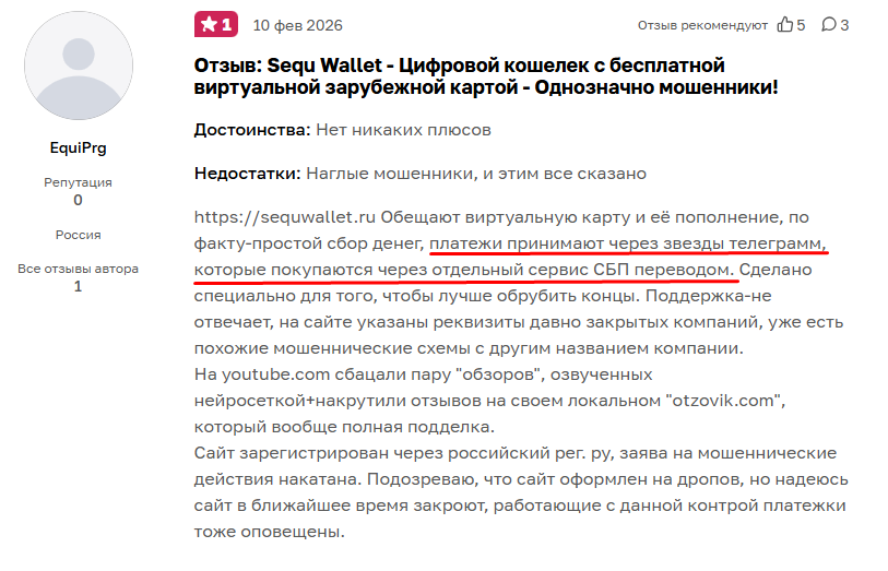 В негативных отзывах о проекте Sequ wallet пользователи указывают, что платежи принимают через Telegram звезды, покупка происходит посредством отдельного приложения. “Специально для того, чтобы лучше обрубить концы” – сообщает обманутый клиент.