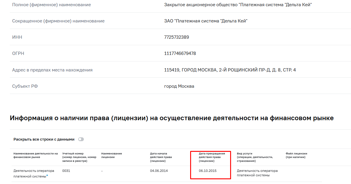 Платежная система Delta key значится в реестре Центробанка как недействующая. Лицензия компании является недействительной с 6 октября 2015 года. Получается, что оператор платежки более не имеет права оказывать услуги.