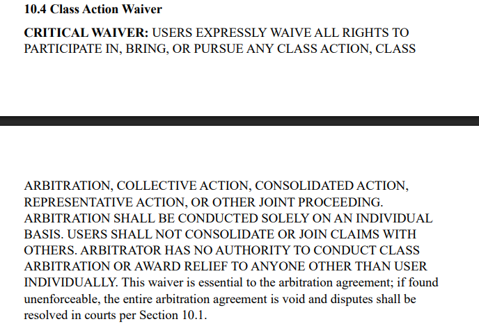 Пользовательское соглашение проекта для русскоязычных клиентов составлено исключительно на английском. Текст правил обязывает пользователя не участвовать в коллективных претензиях к компании.