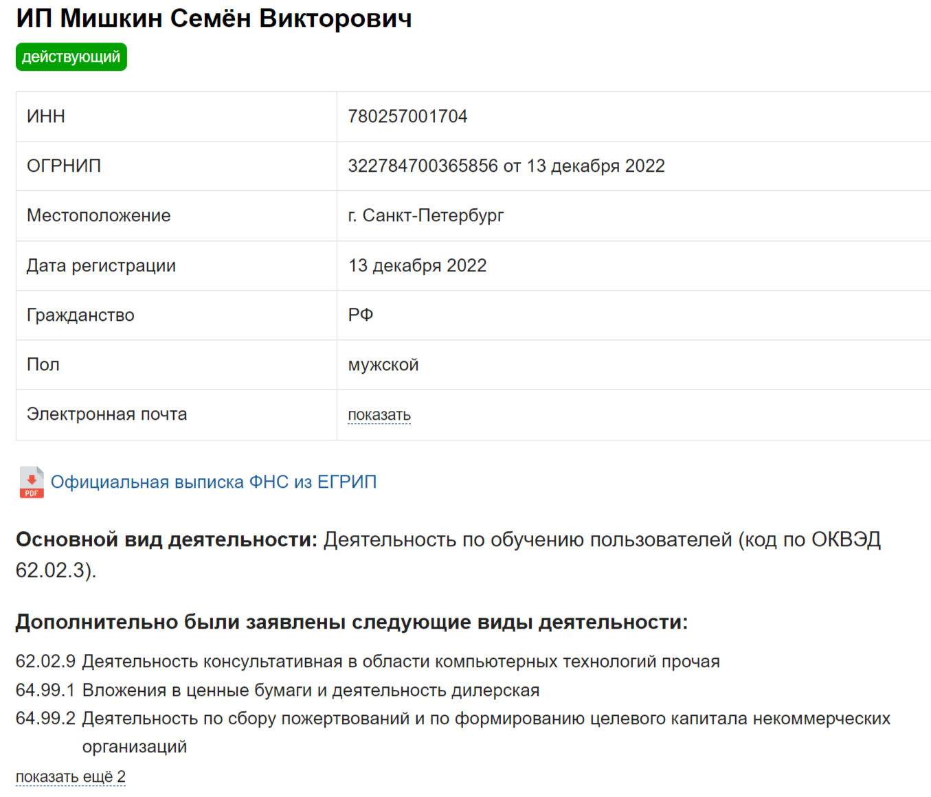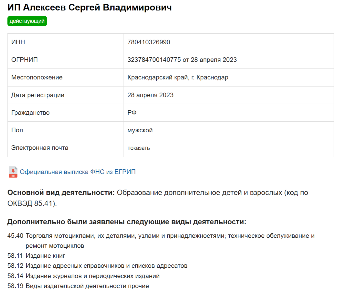 На сайте сказано, что создатель Live Investing prop руководит ОООРБТ с 22 июня 2023-го. В качестве его расположения указан Краснодар. Основной заявленный вид деятельности — дополнительное обучение детей и взрослых. Также указана торговля мотоциклами, издание книг, адресных справочников, журналов и т. д.