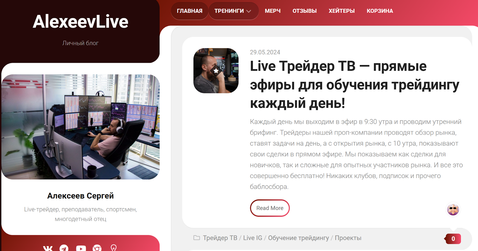 Чтобы понять, Live Investing Group — лохотрон или надежная платформа, важно изучить особенности деятельности самого автора. Для получения подробной информации можно перейти на персональный блог автора alexeevlive ru. Здесь приводится краткая информация о трейдере, ссылки на социальные сети и отзывы о Live School Investing. На сайте периодически появляются прямые эфиры, описание опыта участника рынка и его советы для начинающих пользователей.