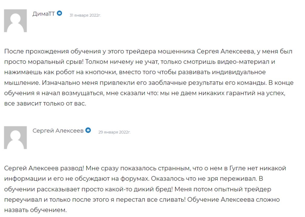 Сергей Алексеев позиционирует себя в качестве профессионала в сфере трейдинга, но по факту таковым не является. Он ничем не подтверждает результаты учеников, не приводит собственную верифицированную отчетность и завышает цены на курсы. Чтобы убедиться в небольшой эффективности материала, можно найти слив Live Investing Group в Ютубе или почитать реальные отзывы.