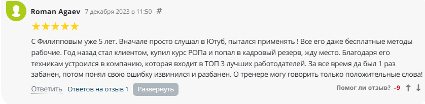 В положительном отклике автор комментария рассказывает, что рад покупке курсов Филиппова. Он утверждает, что, благодаря системе Сергея, компания входит в ТОП 3 на рынке лучших работодателей.