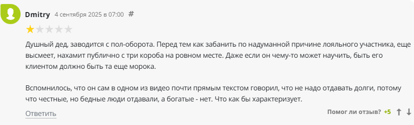 Автор заработал противоречивую репутацию, судя по отзывам об онлайн-курсах в «Мастерской денег» Сергея Филиппова. Некоторые пользователи не доверяют ему, считают его поведение хамским, но есть положительные отклики, в которых благодарят этого человека за интересные темы.
