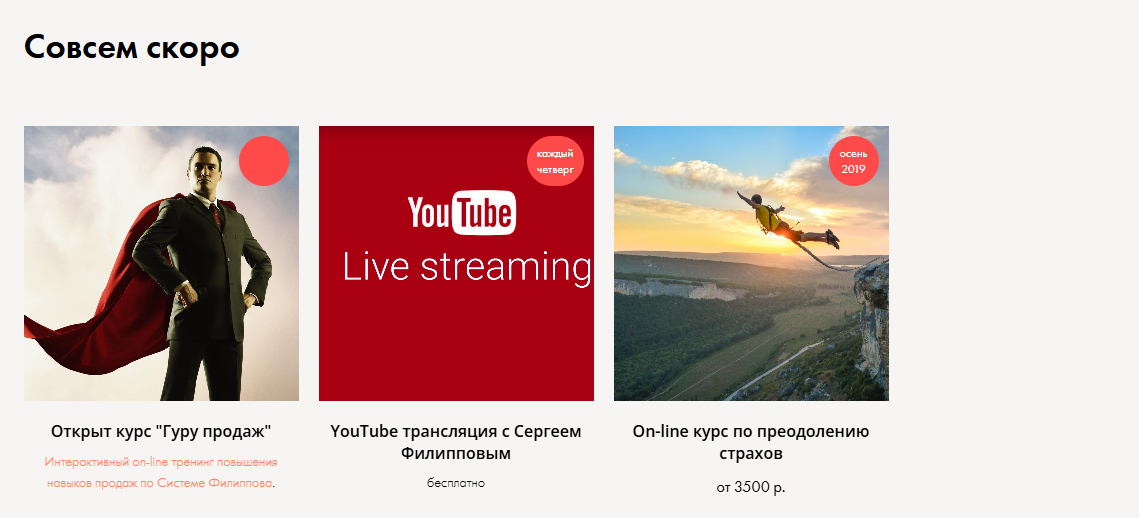 Ученики смогут посмотреть бесплатные образовательные программы, личные расчеты на Ютубе «Сергей Филиппов | Vertex» с ником @Salestrening. Например, наставник предлагает к просмотру еженедельные стримы с обучающими занятиями. Помимо него на сайте можно найти платные уроки «On-line-курсы по преодолению страхов» за ₽3,500. Верифицированной статистики и отзывов от пользователей, купивших и прошедших уроки бизнес-тренера по продажам Сергея Филиппова, нет.