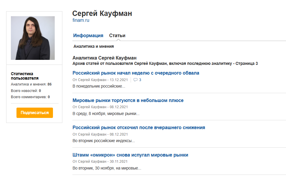 - статьи и обзоры аналитика публикуют в различных Телеграмм каналах и новостных порталах, на сайте компании Финам вышло более 400 публикаций автора.