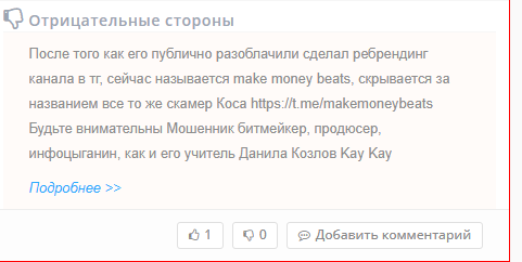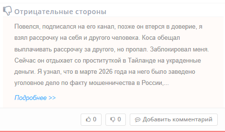 Любые попытки добиться возврата средств или выполнения обязательств заканчиваются блокировкой пользователя во всех каналах и аккаунтах проекта. ProdByKosa – мошенник и в глазах тех, кто вместо обещанной «системы дохода» получил лишь пустой кошелек и разочарование в индустрии.