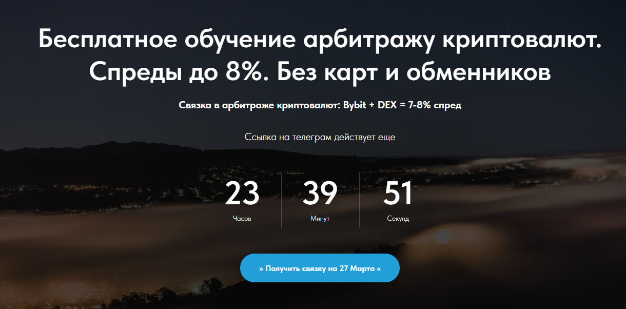 Реклама ведет на astoki click. Там молодой парень рассказывает о том, что проводит обучение арбитражу крипты. Обещает до 8% за круг, что вызывает вопросы. Даже 3-5%, только через обменники и биржи, это слишком.