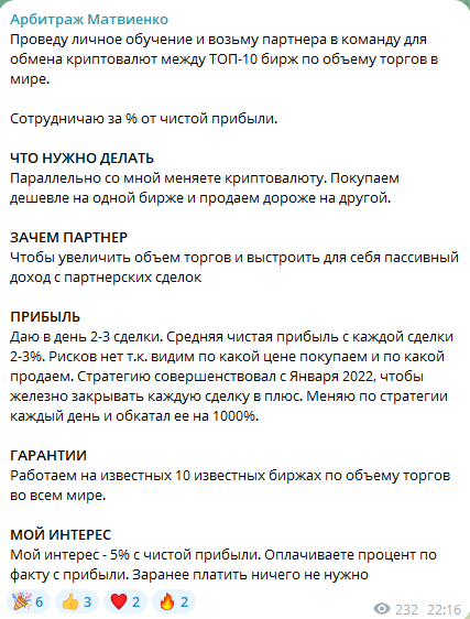 Сергей Матвиенко — арбитражник из Telegram, который продвигает свои курсы. Молодой парень обещает научить зарабатывать до 8% за круг. Вокруг арбитража криптовалют развелось слишком много сомнительных личностей, поэтому нужно проверять, что предлагает Сергей и стоит ли у него учиться.