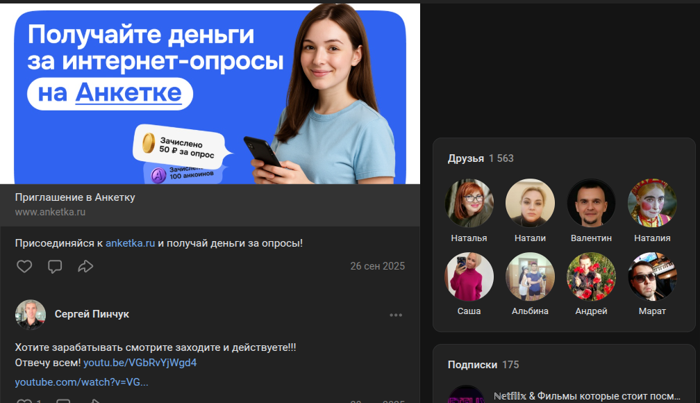 На своей странице во «Вконтакте» https:/ /vk com/ serg3075 помимо платформы Potok Cash продвигает еще одну биржу. Эксперт опубликовал пост по заработку на опросах Anketka ru с реферальной ссылкой.