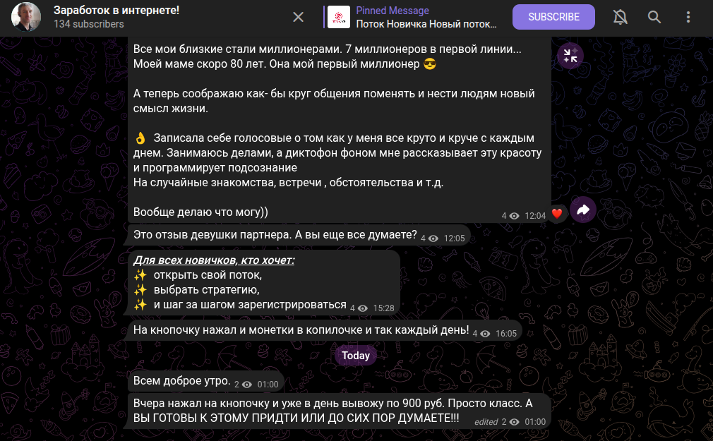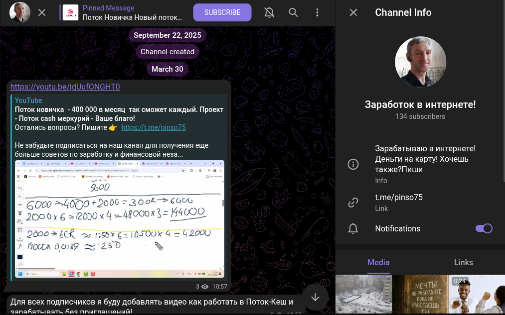 Автор одноименного проекта рассказывает о том, как можно эффективно зарабатывать на проекте Potok Cash. Он обещает, что даже новички получают до 400 000 рублей в месяце абсолютно без напряга. Первый пост по данной платформе эксперт опубликовал 30 марта 2026 года, хотя его телеграм-канал стартовал 22 сентября 2025. В описании сообщества лектор пишет, что он поможет абсолютно каждому зарабатывать деньги на банковскую карту в интернете.