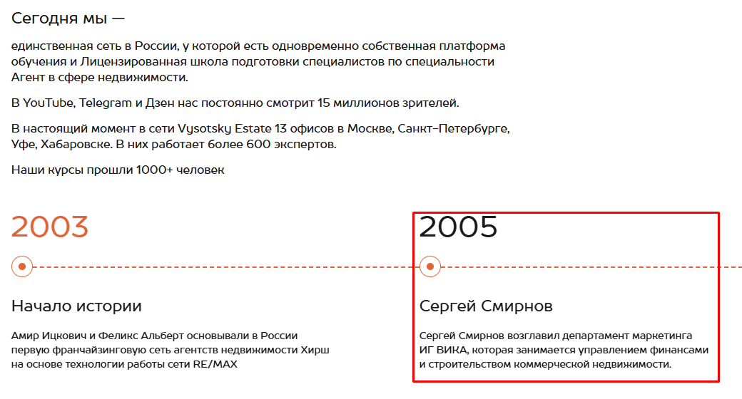 С этими специалистами Сергей Смирнов начал развивать компанию, а также ее представительства в социальных сетях. По состоянию на декабрь 2025 года у Vysotsky Estate работает 13 офисов в разных городах России, а сам наставник занимается проведением курсов обучения и стажировкой начинающих риэлторов.