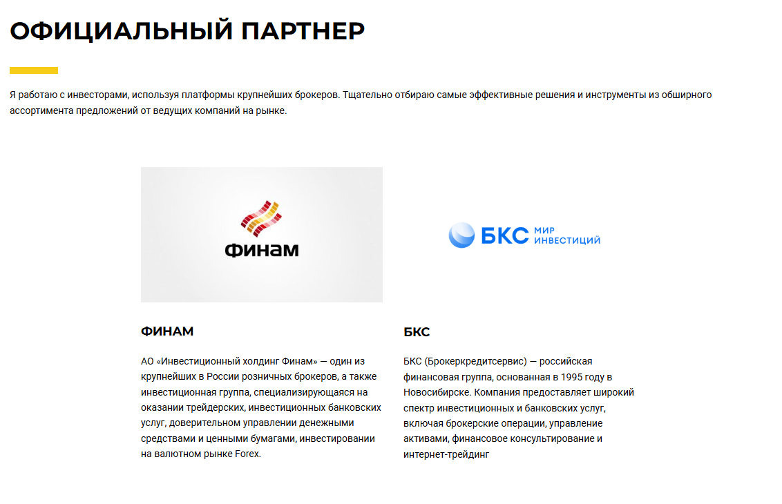 С партнерствами инвестора Sergey Kusakin абсолютно та же ситуация. Да, упоминаются некоторые компании, имеющие определенную популярность. Но вот как с ними связан создатель Kusakin Invest ru – не особо ясно, т.к. на их сотрудничество ничего не указывает.