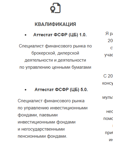 - автор указывает названия своих аттестатов, выданных Центральным Банком, но не предоставляет ссылок или изображений;