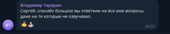 Тем не менее встречаются и положительные отзывы об инвестициях с Сергеем Кусакиным. Однако делать по ним вывод не будет объективным вариантом. Дело в том, что комментариев о деятельности инвестора буквально единицы, но и они размещены в тг-канале. А там, как можно понять, Сергей имеет возможность удалять все, что захочет. Тем более люди преимущественно выражают благодарность за бесплатный контент и ответы на вопросы, но не за платные услуги.
