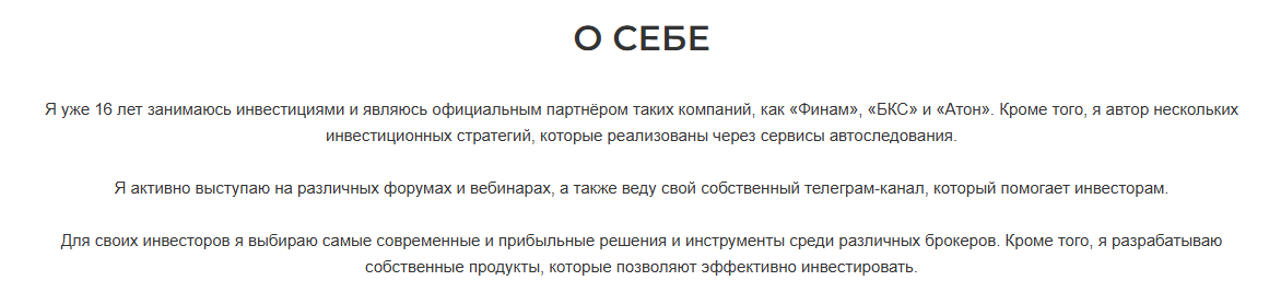 Однако основным ресурсом Сергея, похоже, является его сайт Kusakin Invest ru. Здесь он и предоставляет основную информацию о себе. При этом среди всех сведений ни одно не является подтвержденным. Автор никак не доказывает, что торгует активами и инвестирует уже более 16 лет. Он также упоминает выступления на форумах, но, видимо, по интересному совпадению, ни одно из них не было записано на видео.