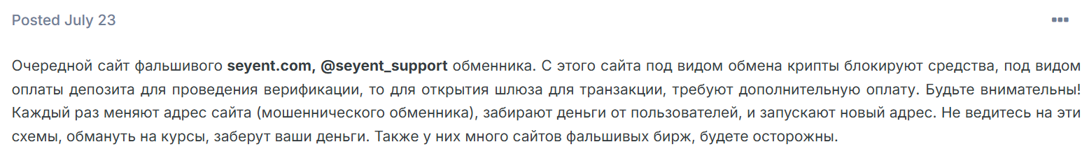 Стоит отметить, что обменник Seyent com не упоминается на сайтах-мониторингах. Поэтому нельзя утверждать о наличии у него надежной репутации. Также следует отметить, что указанный в качестве технической поддержки контакт в Телеграме Seyent support является удаленным. Проверка показывает, что домен сервиса был зарегистрирован 25 августа 2024 года, но обновление было 23 июля 2025 года. Ранее 2025 года упоминания о криптообменнике не встречаются. Также оказывается, что сайт продавался и его как раз могли выкупить мошенники для запуска лжеобменника.