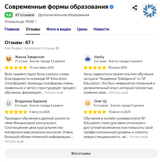 Отзывы об обучении на курсах в школе SF EDUCATION в интернете положительные. На Яндекс-картах оценка 5 из 5. Ученики отмечают следующие основные плюсы: