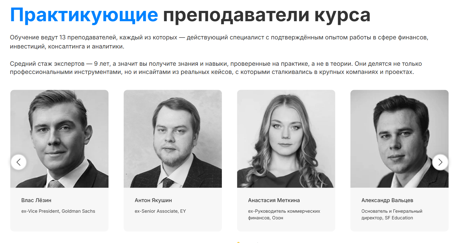 На сайте представлено 13 кураторов, которые ведут курс «Финансовый аналитик».