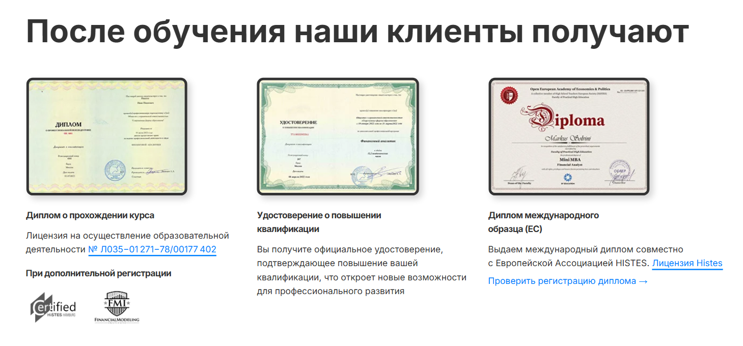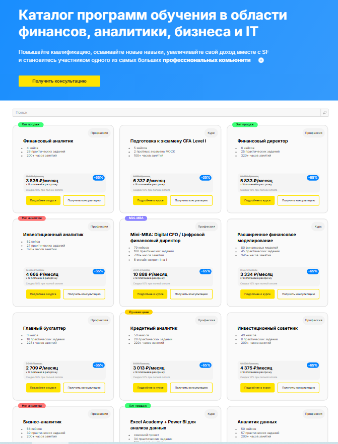Помимо курса «Финансовый аналитик» в этой компании можно освоить разные профессии в сфере финансов, аналитики, трейдинга, бизнеса и IT, а также подготовиться к сдаче некоторых экзаменов.