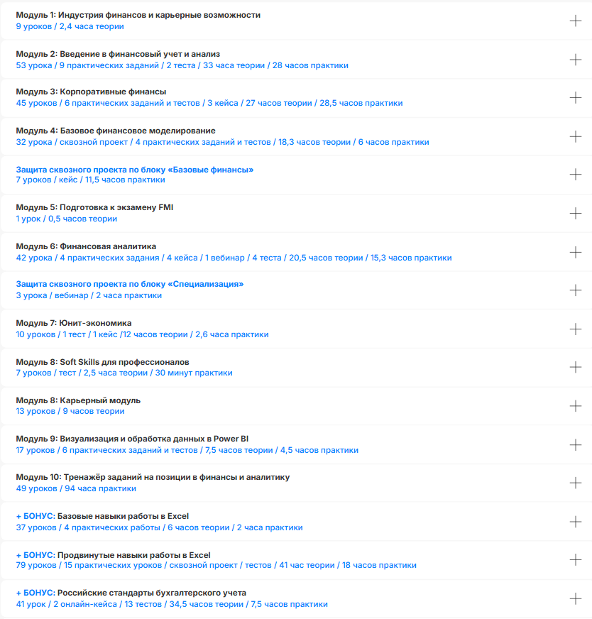 Длительность курса «Финансовый аналитик» – 4 месяца. За это время ученики проходят 10 основных модулей. При желании дополнительно можно изучить бонусные модули.